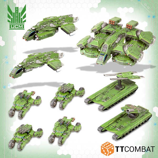 A combined arms approach is typical of the UCM army. Utilizing small numbers of soldiers piloting heavily armoured vehicles, they make their limited numbers count. Using a mix of fast moving buggies and heavy tanks the ground is covered, with air support to deal with dangerous threats. Getting in and out quickly is key to UCM battle philosophy, so being able to take on all threats is important to making that happen.