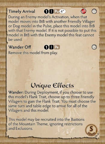 Long before she joined the Temple, Hiko had the spirit of the air within her, leading Hiko to explore far and wide, leaving her parents to worry. But that fear ended when she returned from exploring one day with a large mountain dog at her side that quickly became her stalwart companion. She named him Byiba, and the two were inseparable even when the local monks laid claim to the massive dog who had once been theirs. But no matter how hard the monks tried, the dog stayed by her side. Not long after her interactions with the Temple, Hiko decided to join them, which was the only way the dog would return to his former companions. Hiko’s uses may not be as evident as some other, more directly powerful models, but she excels at movement and placement. She also allows more Flanking models, which creates synergy with Byiba, while her combat shenanigans can turn a brutal melee in your favour. Villager models can often become outclassed, so any help offered by other models is always beneficial, and we are interested to see how players will use the Wander Off Ki Feat.