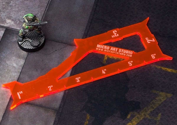 A measuring tool made of 3mm transparent and fluorescent green acrylic that enables you to quickly and precisely check all the most common distances during gameplay - 1", 2", 3" and 6".