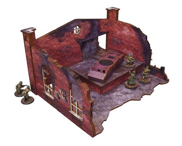 Multicolor prepainted (UV-printed) WW2 Ostfront Stalingrad Factory Back (with ramp) is a part of a ruined manufactory building with a ramp and bare tank hull that forms a full ruined factory together with Stalingrad Factory Front (available separately).