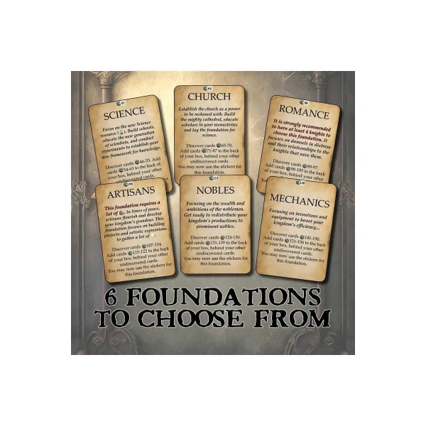 his box contains 3 expansions for Kingdom Legacy – Feudal Kingdom; ”The Black Plague”, ”Invasion”, and ”Nature’s Revenge”. Each expansion lets you discover 2 out of 6 foundations to continue your progress towards fame and fortune.