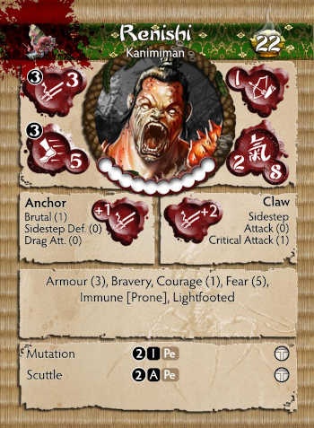 This ‘lobstrosity’ has been Blessed by the Ocean and is known as the Killer Claw among his shipmates. With a form more suited to life at sea, specifically a pirate's life at sea, with his armoured frame, snapping claws and great strength, Renishi can hold a flank (Or a Deck) against all foes. Any who dare attack him are often left blooded and at the mercy of the sharks, the Jung's other fearsome sailors. Jung players can pretend to be Bear Clan for a while with access to Armour (4), but unlike their Minimoto foes, Renishi can also Regenerate his whopping ten boxes. Harder to kill than a whole warband of Kaizoku, Renishi also has excellent melee abilities, and his spines cause Bleed Markers offering another route to getting those Shark charges off.