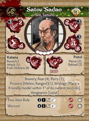 With Shiho Hiroto's return, the Takashi have had to act. However, they cannot show weakness and must take the more subtle option. Sadao is empowered to root out and eliminate the Shiho threat, which he does with great success, travelling the lesser-known paths of Jwar from village to village. He hunts Shiho sympathisers, who dare provide arms, support, or information on Takashi troop movements. All earn his ire, and he leaves a trail of dead Shiho loyalists in his wake. Sadao adds a new element to both Claws of the Dragon and Blood of the Dragon and any future Hare Clan themes.