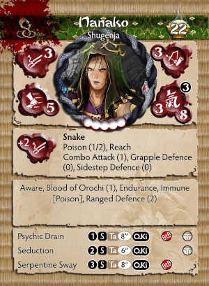 It is said that shisai are aligned with a kami’s purpose and that is how the kami grant them power. The opposite is said of shugenja, that they take the power and use it for their own ends with no regard for cosmic balance. The shisai of Orochi are certainly faithful to the serpent kami and work to serve Orochi’s will. The shugenja may take Orochi’s power for their own, but this does not seem to displease Orochi in the slightest. Perhaps such selfish acts are aligned with Orochi after all. Nanako has been faithful to Orochi from childhood, and she has watched as the Ito came, seizing their place at the head of Orochi’s temple. This rankles her, for she has had to claw her way to power, fighting for every scrap. For some outsiders to come and simply slide into Orochi’s favour? That would not do for Nanako and she has redoubled her efforts, taking from Orochi what the great kami would not gift her. It was through her efforts that the abominations were created, by infusing others with undeserved power stolen from the great kami. Some say that for her efforts, Orochi has seen fit to reward Nanako. Now a great guardian serpent ensures that no others will interfere with her work. Others whisper that her serpent is, in fact, an old rival that she has inflicted with her ministrations.