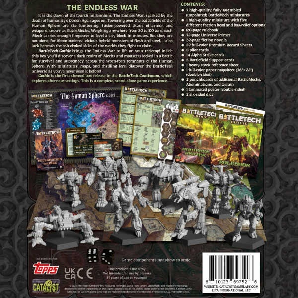 8 high-quality, unpainted miniatures 1 Rulebook 1 Fiction novella, Reclamation and Rise 1 BattleTech Gothic: Universe Primer 14 Alpha Strike Cards Full-color BattleTech Record Sheets 8 Pilot Cards 5 Battlefield Support Cards 1 heavy-stock reference sheets Punchboards of trees and game counters 1 Poster map 1 Mapsheet 2 dice