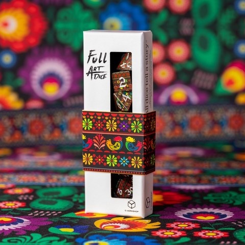 Every thread carries a story — colorful, rhythmic, and woven from memory. Krajka, the traditional sash once worn by the Slavs, was more than ornament — it was identity, protection, and pride. Its geometric patterns and familiar symbols spoke the language of heritage, and belief. Full Art Dice™: Krajka draws on this timeless craft, turning folk artistry into vivid design. Deep red fields intertwine with multi-colored threads, flowers and birds, echoing the strength and beauty of handmade tradition.