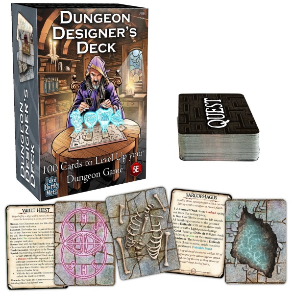 This 100-card deck is your gateway to dynamic dungeon adventures for 5E (easily converts to other systems). It is essentially a random dungeon generator tool in a box, complete with battle map, terrain tokens and a host of random encounters, quests, quickstart rooms and more.
