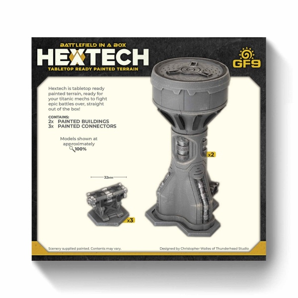 Hersteller: Gale Force Nine Maßstab: 6mm Material: Resin Fully Painted and Tabletop Ready The Hextech Industrial Fluidworks set is a modular construction set designed to meet the chemical, fuel, or water processing and logistics needs of any size installation, from military bases to sprawling mega-cities. The Hextech range range is compatible with all sci-fi 6mm to 10mm Epic Scale miniatures games, including Polyversal, Legions Imperialis, BattleTech, Future War Commander, Steel Rift, Adeptus Titanicus, and much more! Contains 2x Painted Buildings and 3x Painted Connectors