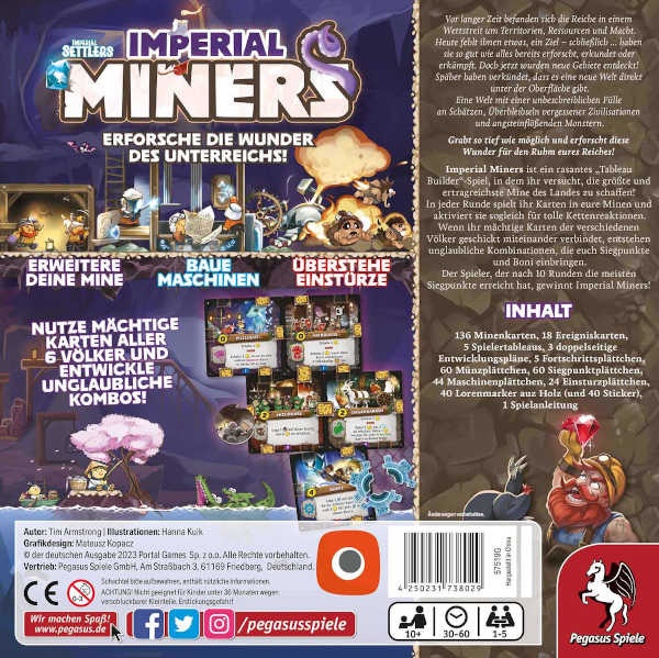 Imperial Miners ist ein leicht zugängliches Engine-Building-Kartenspiel für ein bis fünf Spielende. Mithilfe eines cleveren Kartenaktivierungssystems versuchen sie, die ertragreichste Miene des Landes auszuheben. Dazu spielen sie Karten in ihr persönliches Tableau. An der Oberfläche beginnend entwickelt sich die Miene Karte um Karte nach unten. Jedes Mal, wenn eine Karte der Mine hinzugefügt wird, aktiviert sie sich selbst und alle darüber liegenden Karten und belohnt die Spielenden mit Kettenreaktionen. Sechs verschiedene Völker bieten unterschiedlichste Strategien. Während die Spielenden ihre Minen entwickeln, kommen sie auch auf den Fortschrittstafeln voran und erhalten so im Laufe des Spiels zusätzliche Boni.