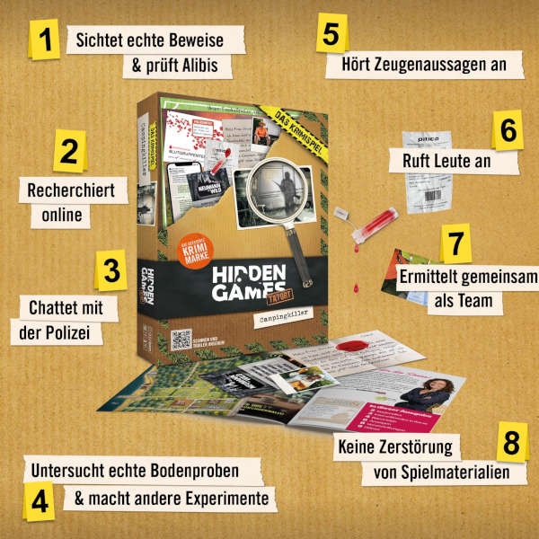 Wer von den Campern kommt für die Tat infrage? Helft Kommissar Hahnke Licht ins Dickicht aus Streit und Intrigen zu bringen.