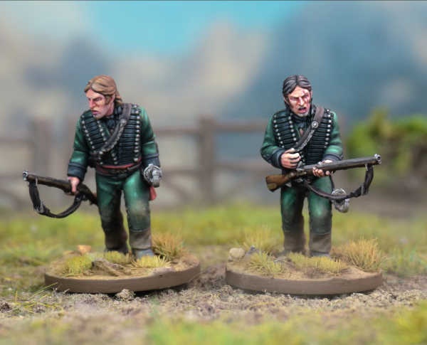 The 54mm model is a display piece that comes with a scenic base. The 28mm version is true multi-part and has two arm and head options shown here and includes a textured base as well. Chris Hindmarsh has painted the two versions - one to look like Sharpe as per the television show and the other depicting Sharpe as described by Bernard Cornwell in the novel: tall, dark haired, and with a savage scar on his left cheek that made him look like an “execution”.