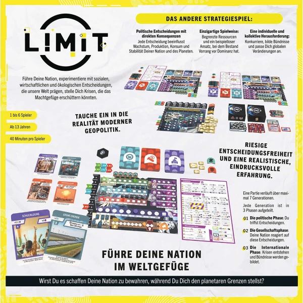 LIMIT ist ein anspruchsvolles Zivilisationsspiel, in dem du über sieben Generationen hinweg das Schicksal einer Nation lenkst. Von 1850 bis 2060 entscheidet ihr, wie eure Bevölkerung wächst, wie ihr die Ressourcen nutzt, mit den Krisen umgeht – oder welche ihr verursacht. Jede Runde stellt ihr die politischen Weichen, beeinflusst globale Märkte und baut euer Produktionssystem aus, während soziale Unruhen, Umweltzerstörung oder Finanzkollaps drohen. Der besondere Kniff: Es gibt kein „richtig“ oder „falsch“.