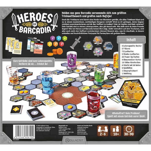 Heroes of Barcadia ist ein Partyspiel für Erwachsene, bei dem ihr als tollkühne Helden zu einem Trinkwettbewerb antretet und nach dem meisten Ru(h)m greift. Eure Trinklaune wird dabei allerdings von einer Horde Monster getrübt, die ihr im variabel aufgebauten Dungeon bekämpfen müsst. Eure Becher (mit Inhalt eurer Wahl) stellen hierbei eure Heldenfiguren und ihre Lebenspunkte dar. Wenn ihr welche verliert, müsst ihr trinken! Dabei solltet ihr euren Mitstreitern nicht zu sehr vertrauen, denn sie werden die erste Chance nutzen, euch tief ins Glas schauen zu lassen. Beweist, was ihr draufhabt, und findet den „Suffhort“ bevor es die anderen tun, in diesem schnellen und feuchtfröhlichen Partyspiel für Fantasyfans mit großem Durst.